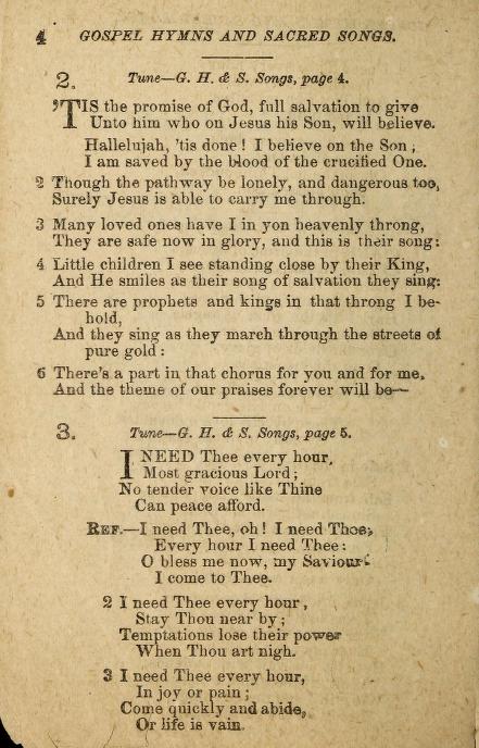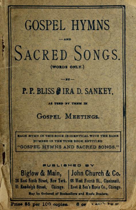 The gospel song movement reached its high point with the publishing of Philip Paul Bliss’s (1838-1876) and Ira D. Sankey’s (1840-1908) Gospel Hymns and Sacred Songs (1875). Both men traveled as song-leaders with well-known revivalists, Bliss with D.W. Whittle and Sankey with D.L. Moody. Bliss and Sankey also affiliated with their own established publishing companies. Bliss even created the name for the gospel song genre when he published a song book entitled Gospel Songs (1874). As a result of their combined influence and capacities, Gospel Hymns and Sacred Songs sold over 50 million copies by the turn of the 20th century.