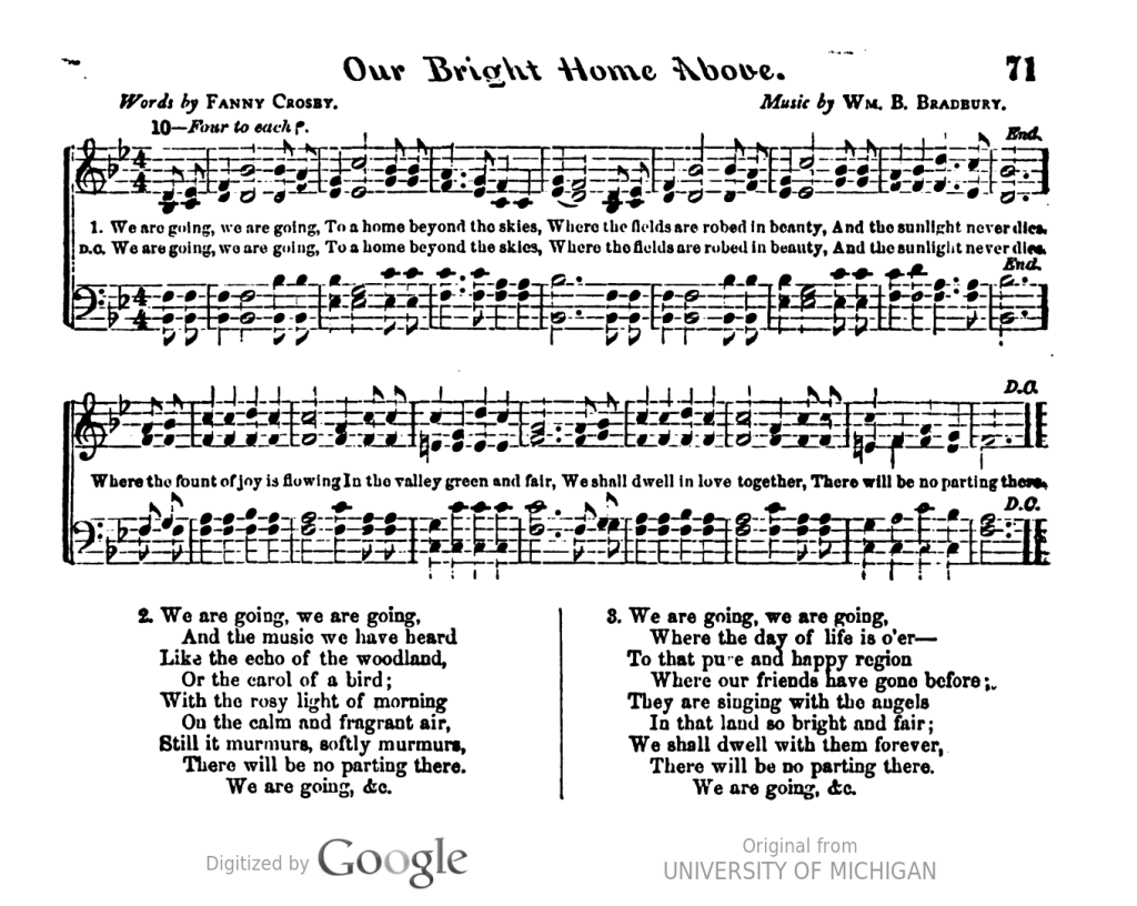 It is well-known that Crosby became blind at just six weeks of age due to mistreatment of an illness. When she was fifteen years old, she began attending the New York Institute for the Blind. There she became a grammar, rhetoric, and American history teacher, and remained in that position for 23 years. While at the Institute for the Blind, Crosby began writing texts in collaboration with the institute’s music teacher, George F. Root, and she enjoy considerable success in publishing verse. She had met many important figures such as U.S. Presidents Van Buren and Tyler.