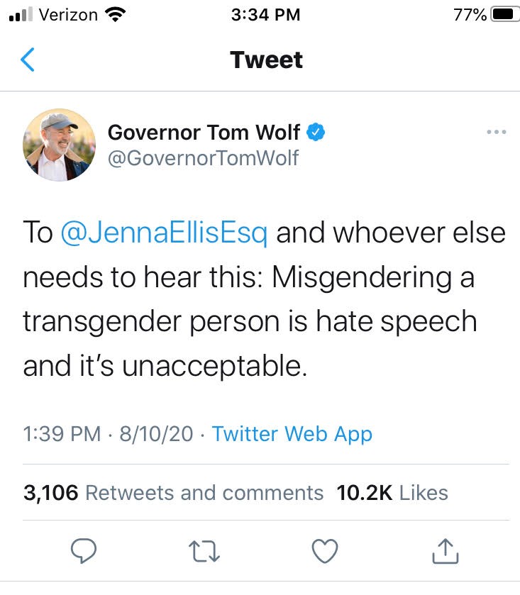 Governer Wolfe’s tweet was in response to a conversation I won’t get into right now, but my basic point is that the governer held up a standard. He claims if I believe it is wrong for people to change their gender, and I call them by their original gender, then I am speaking with hatred and such speech is unnacceptable. In other words, he said “You should be ashamed of yourself.” Shame occurs any time an individual violiates a set standard, whether or not that standard is correct.